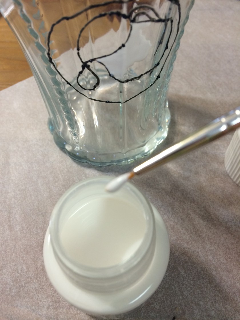 Now it’s easy to trace your design! The thicker Vitrea paint for outlining comes in 20 mL tubes. Blick did not have white, so I settled for black.