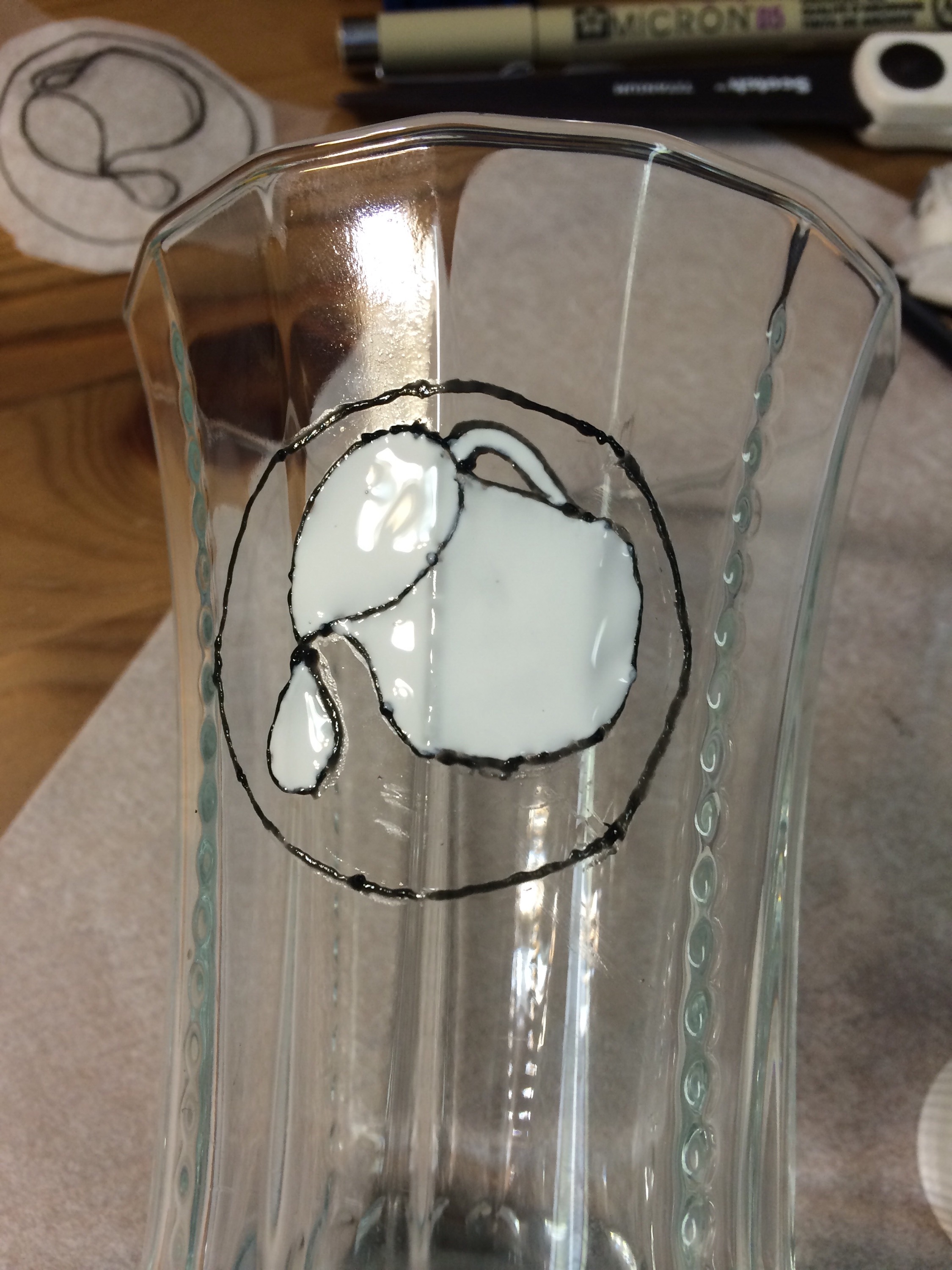 Because the paint is somewhat pricey and a little goes a long way, this project is well suited to making many cups with one motif. Here I am using my household’s badge, and plan to make more glasses just like this one.