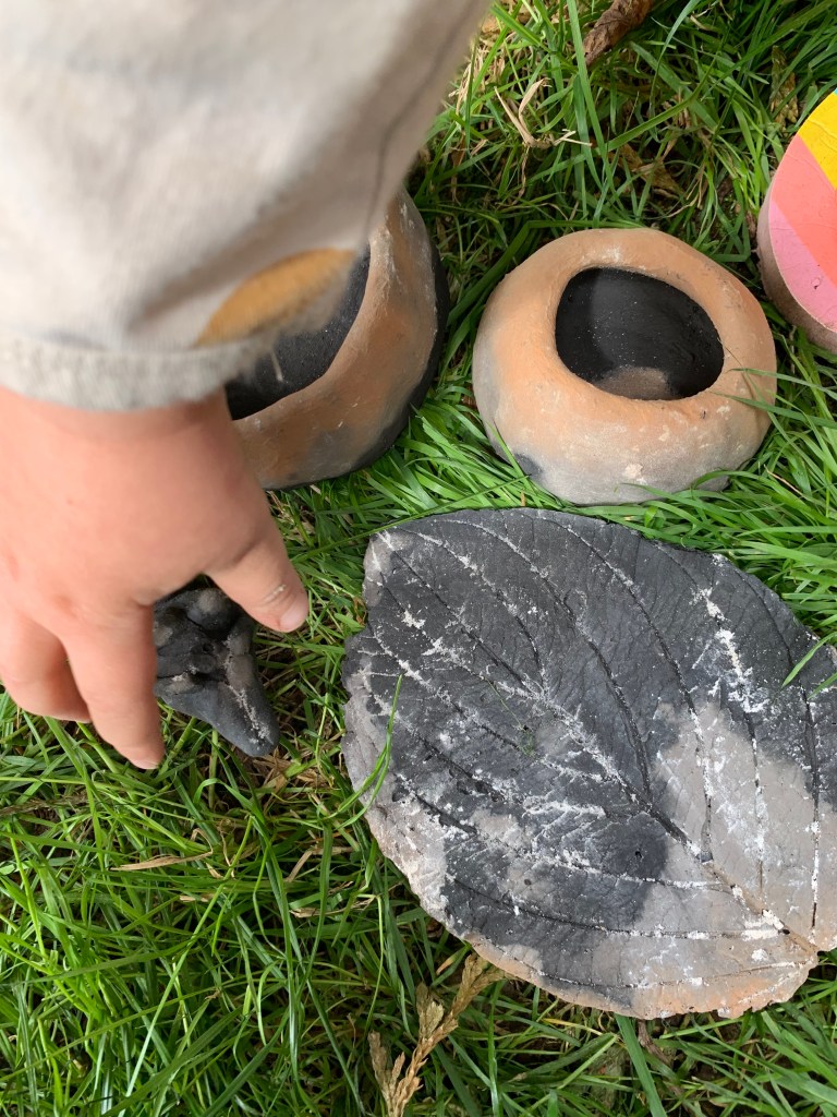 My two-year-old helped dig out the finished pottery. He was most interested in the “puhsun” (person) and “eef” (leaf). Although parts of it aren’t suitable for kids, a lot of this project was something that he and I could do together. He helped me dig the hole, he helped me with stirring and straining all that muddy water, he loved squishing the clay in his hands, and he helped me pick a leaf and press a ball of clay onto it for a second leaf plate (which is still drying). Older kids could have even more fun with this, and the opportunities for learning about history, archeology, art, physics, and chemistry are immense.