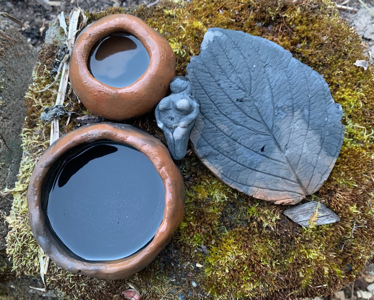 You can wedge the clay to get the air bubbles out, which I didn’t really know how to do so I sort of half-assed that part, then build whatever you want to make. I made pinch pots, a goddess figurine, and used a leaf to make an impression on a thin slab of clay. It’s important to keep your pieces thin enough to dry easily. Once you’re happy with what you’ve made, put them in a safe, covered space and let them air dry as long as you can stand it. I think I made my first round of stuff in like April and didn’t fire them until July. Steam is what makes pots explode, so if you know you didn’t do a great job getting the air bubbles out, drying is crucial.